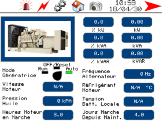 Imaginer, votre groupe électrogène alimente votre édifice en situation d'urgence. Un problème survient et votre groupe électrogène arrête. Il fait noir. C'est la panique! Au fond de votre salle électrique, un panneau de 5,7'' illumine votre pièce, avec comme image, un gyrophare rouge. Vous appuyez sur ledit gyrophare et consultez la table d'alarme. Vous visualisez rapidement le problème et prenez action pour le régler.